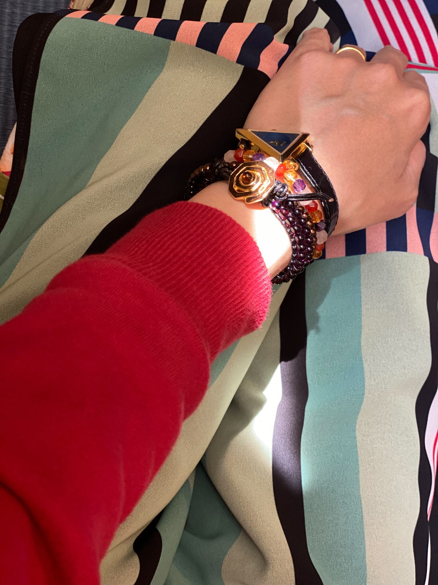 ひまわりのようなメタルボタンと歴史あるチェコビーズをラップブレスレットとして仕上げました。
