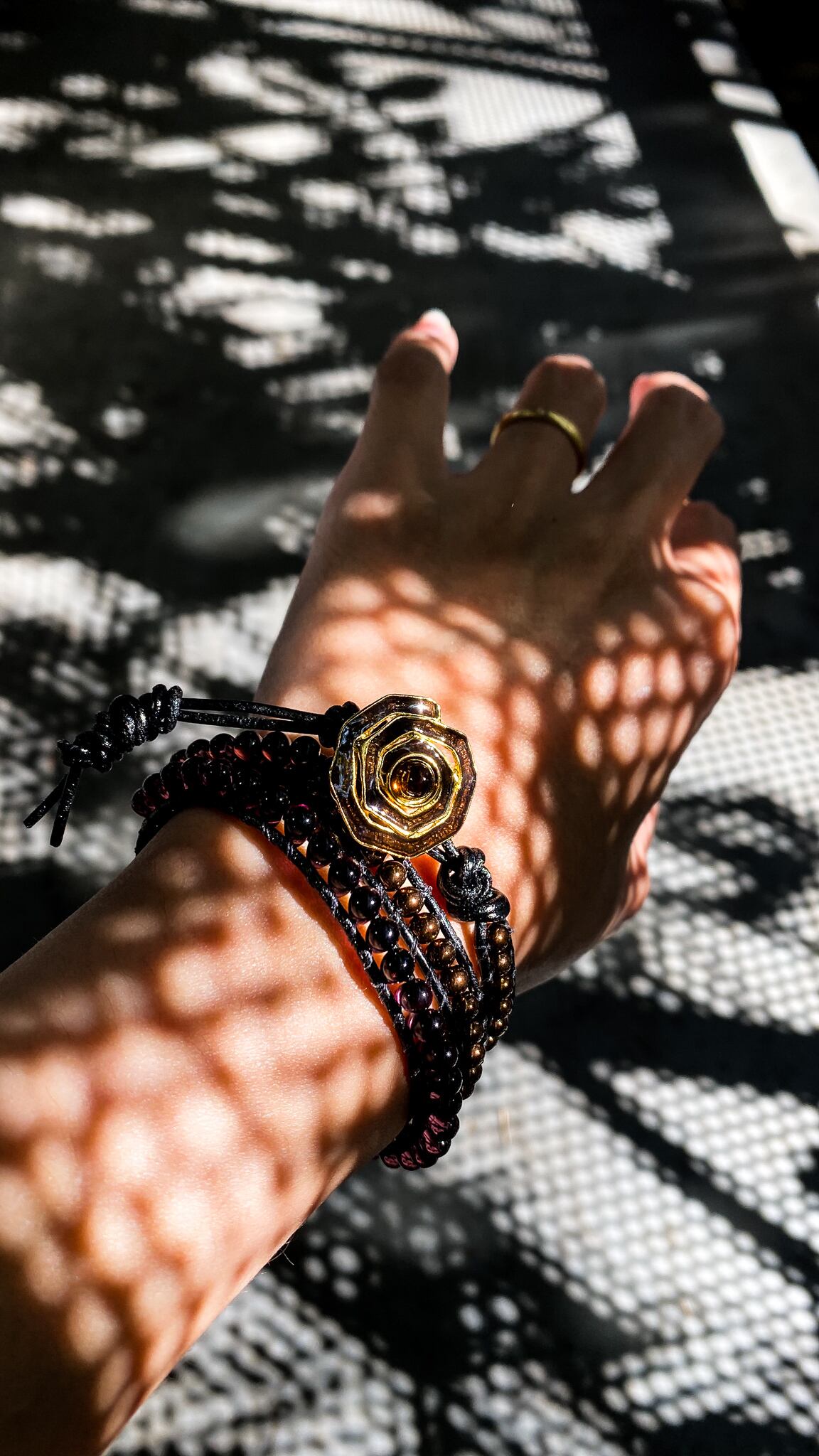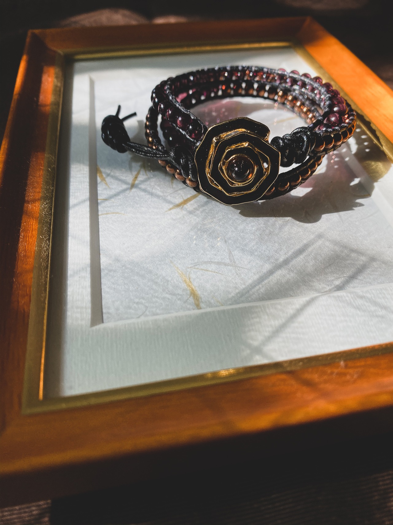 元気いっぱいの象徴であるひまわり、わたしはひまわり畑の影や枯れゆくひまわりの風情に焦点を当て、ラップブレスレットで表現してみました。