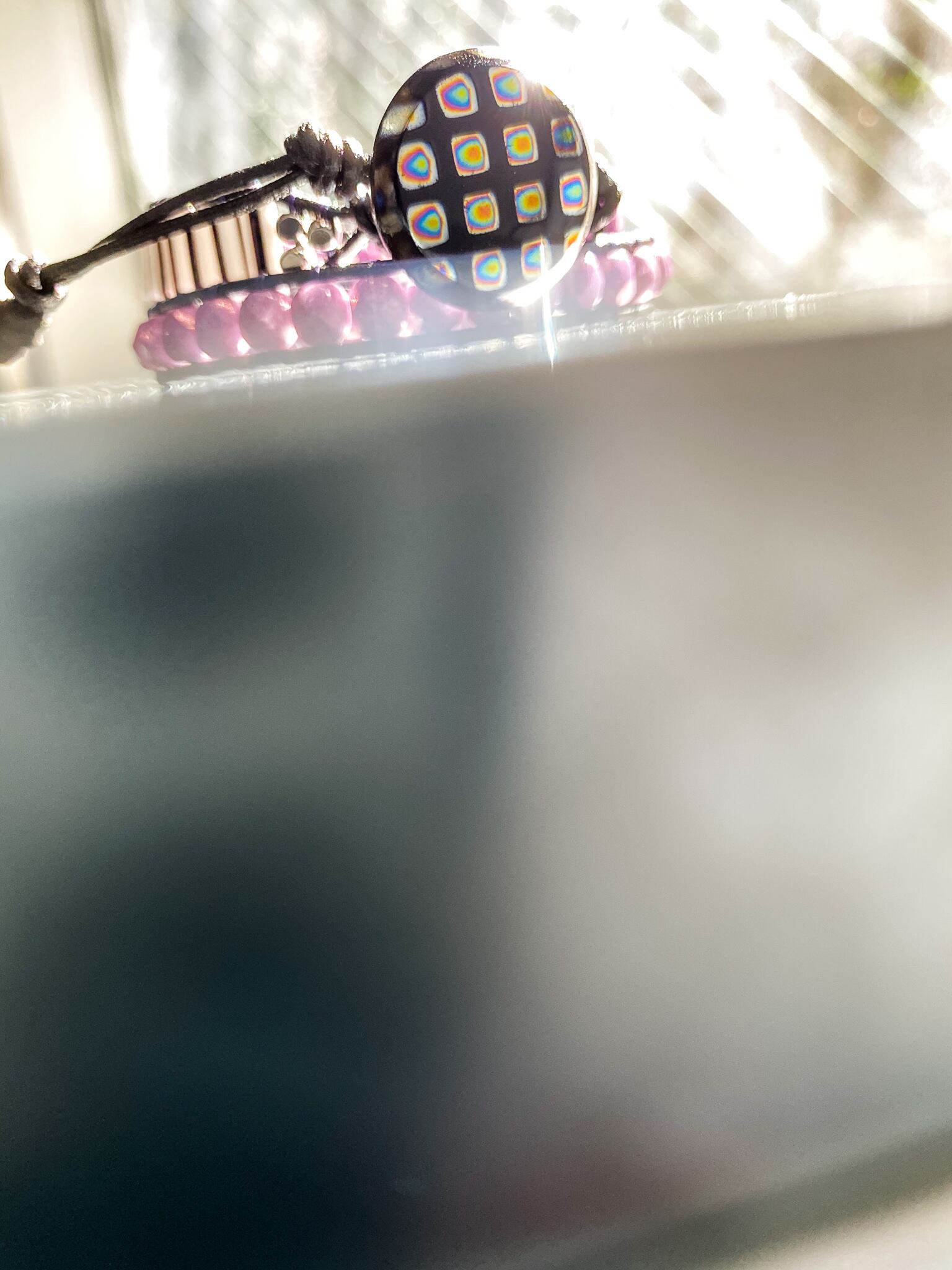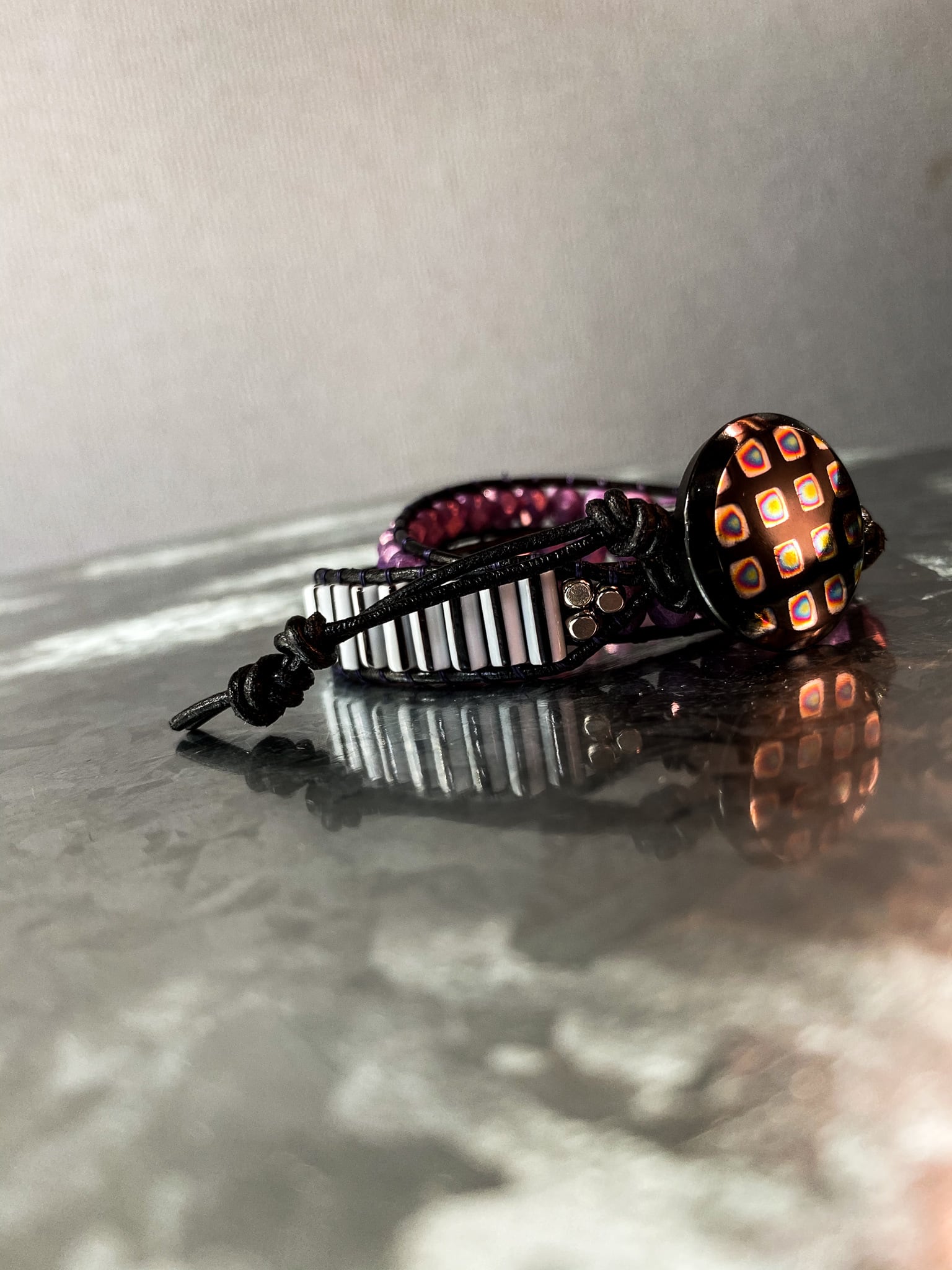 34cm,37cm(2stage length adjustable)/glass button(Czech)/glass fire polish beads(Czech)/glass pipe beads(Czech)/metal beads/genuine leather strap(Japan)