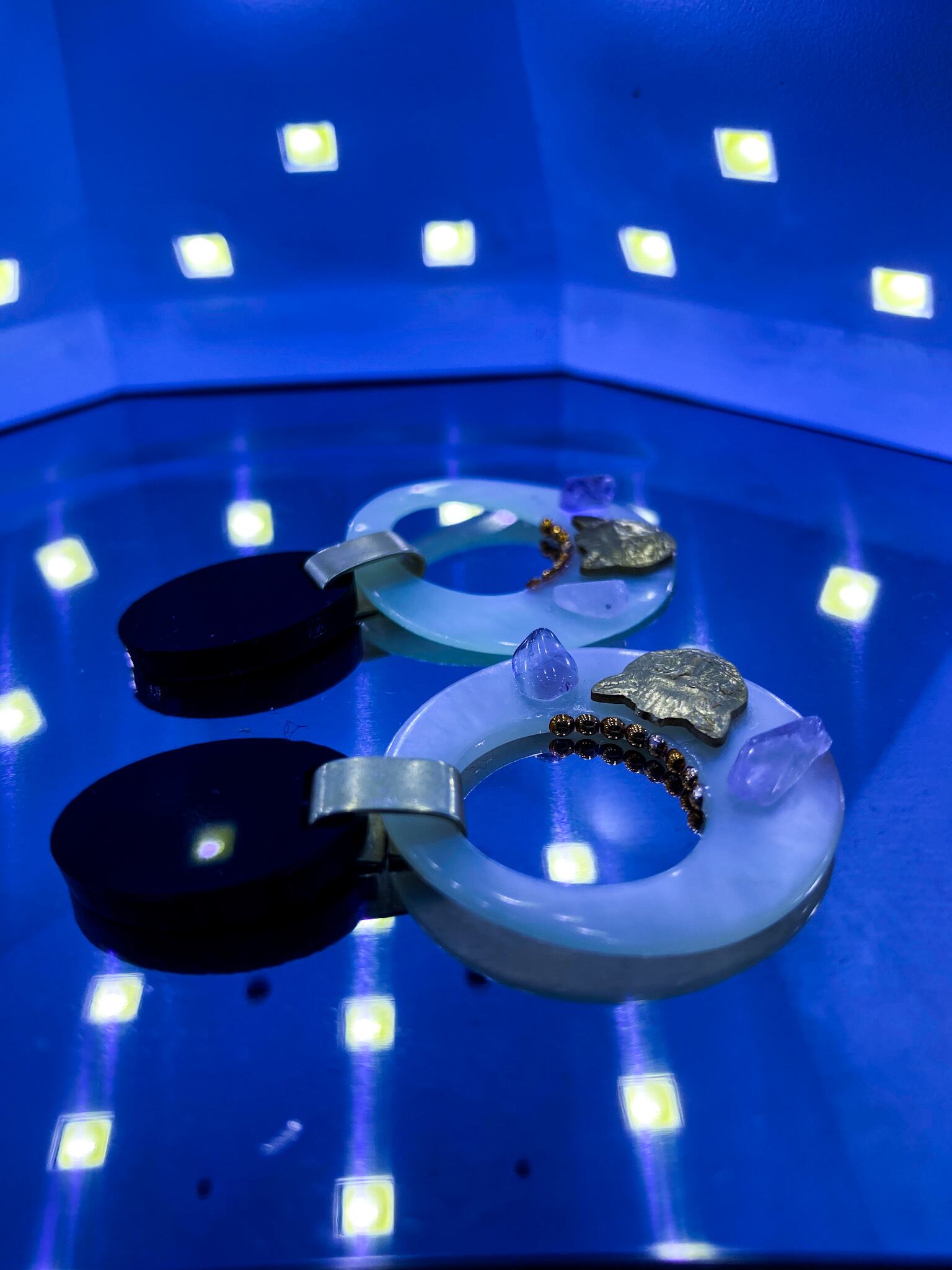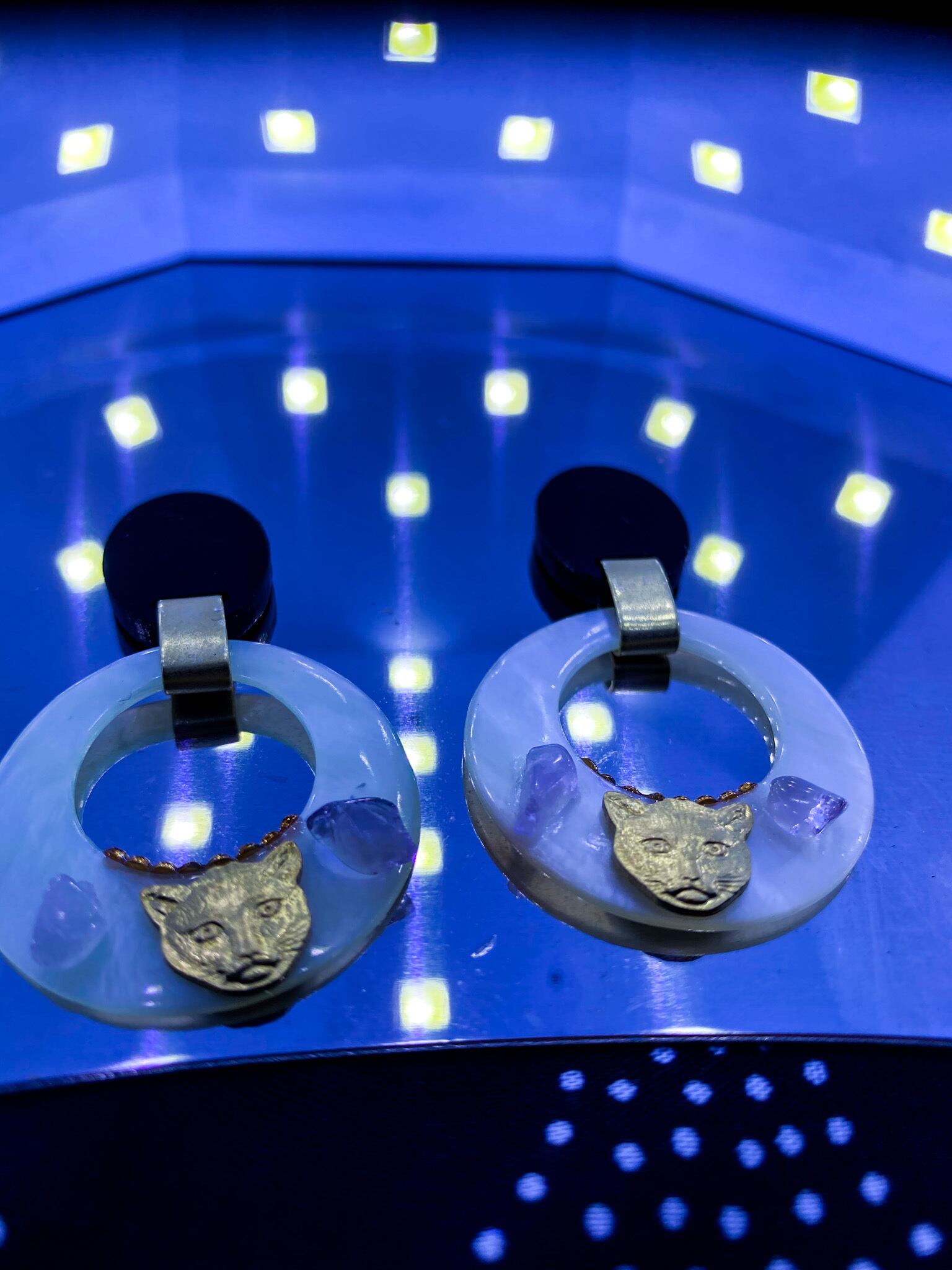 シェルパーツにはアメジストのチップストーン、幸運をもたらしてくれるキャットフェイス、縁にはスタッズがあしらわれています。
