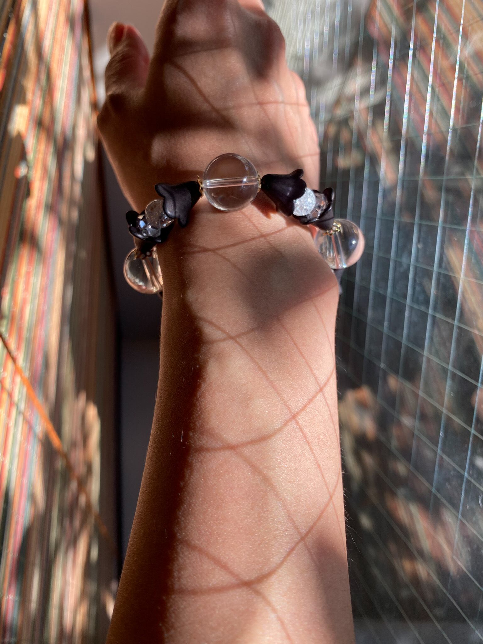 それにクラック水晶、平カット水晶、現在は入手出来ないマットブラックの花びらのようなビーズ。