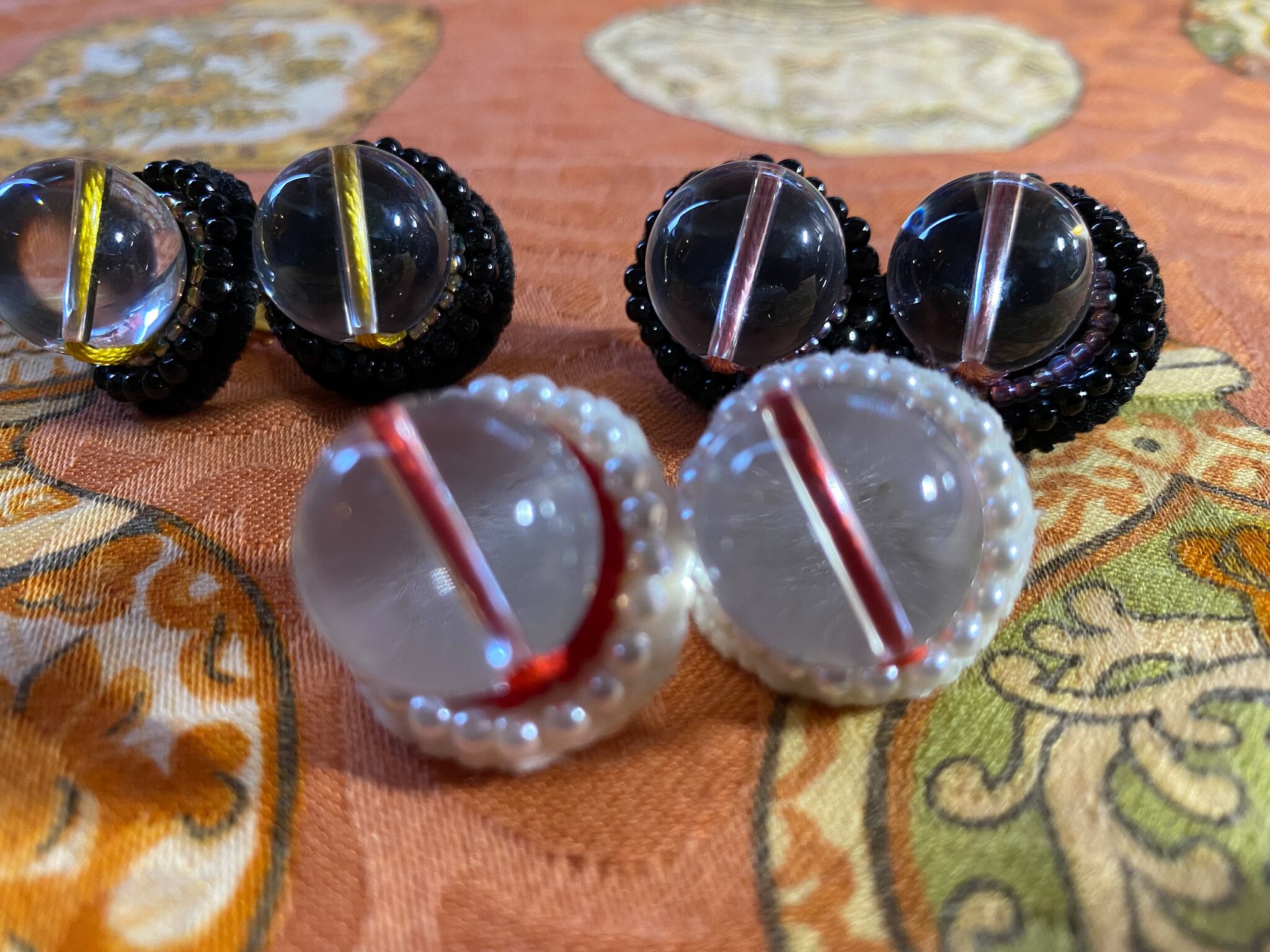 水晶に通してある美しい絹糸は、明治創業の金亀糸業。