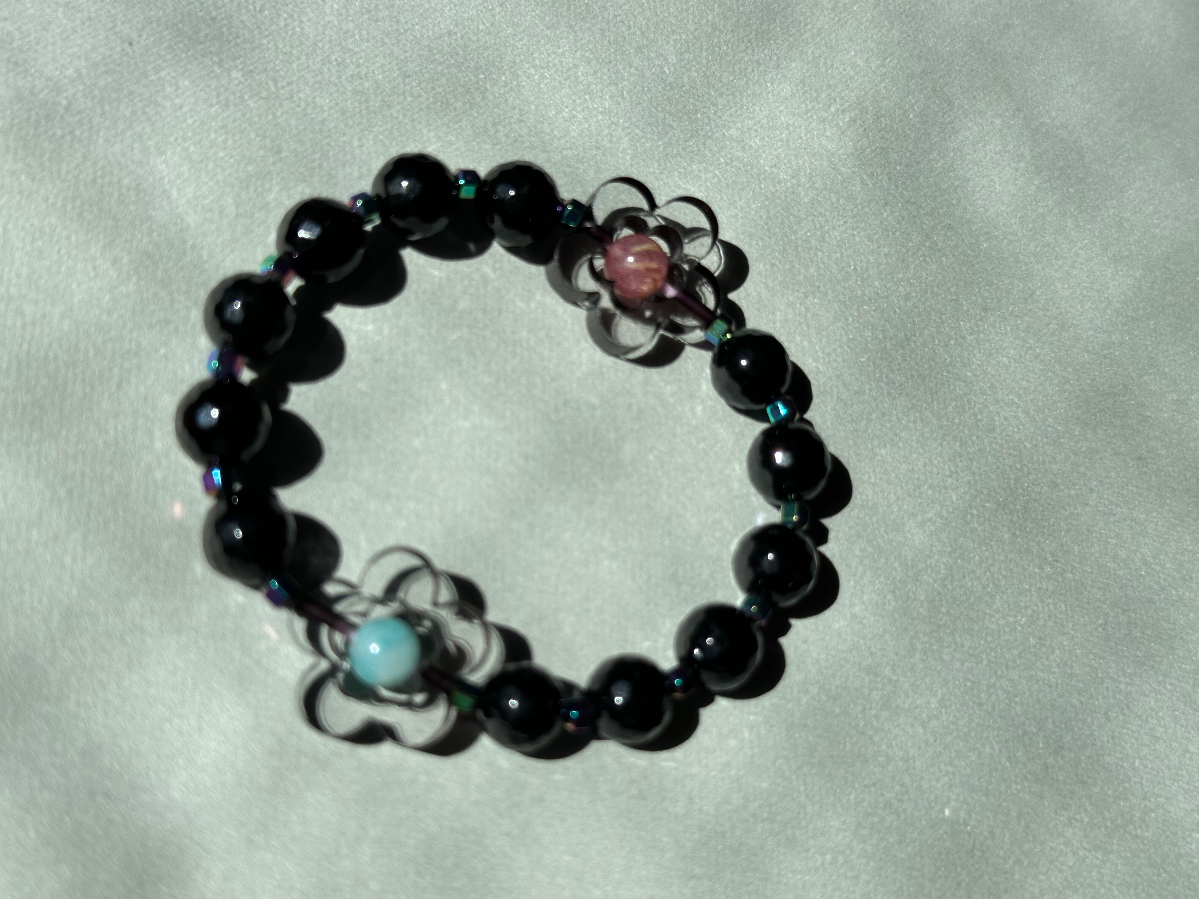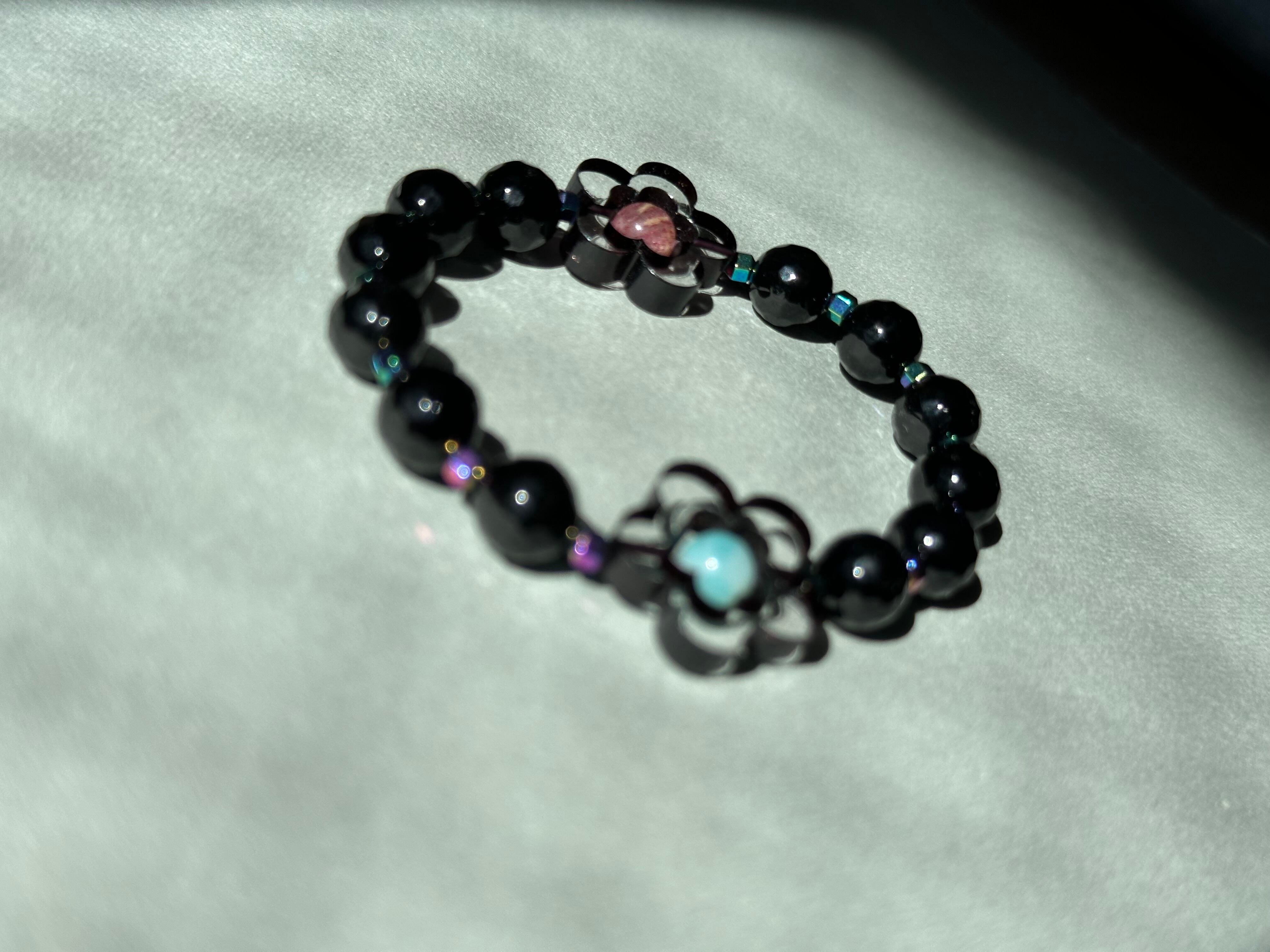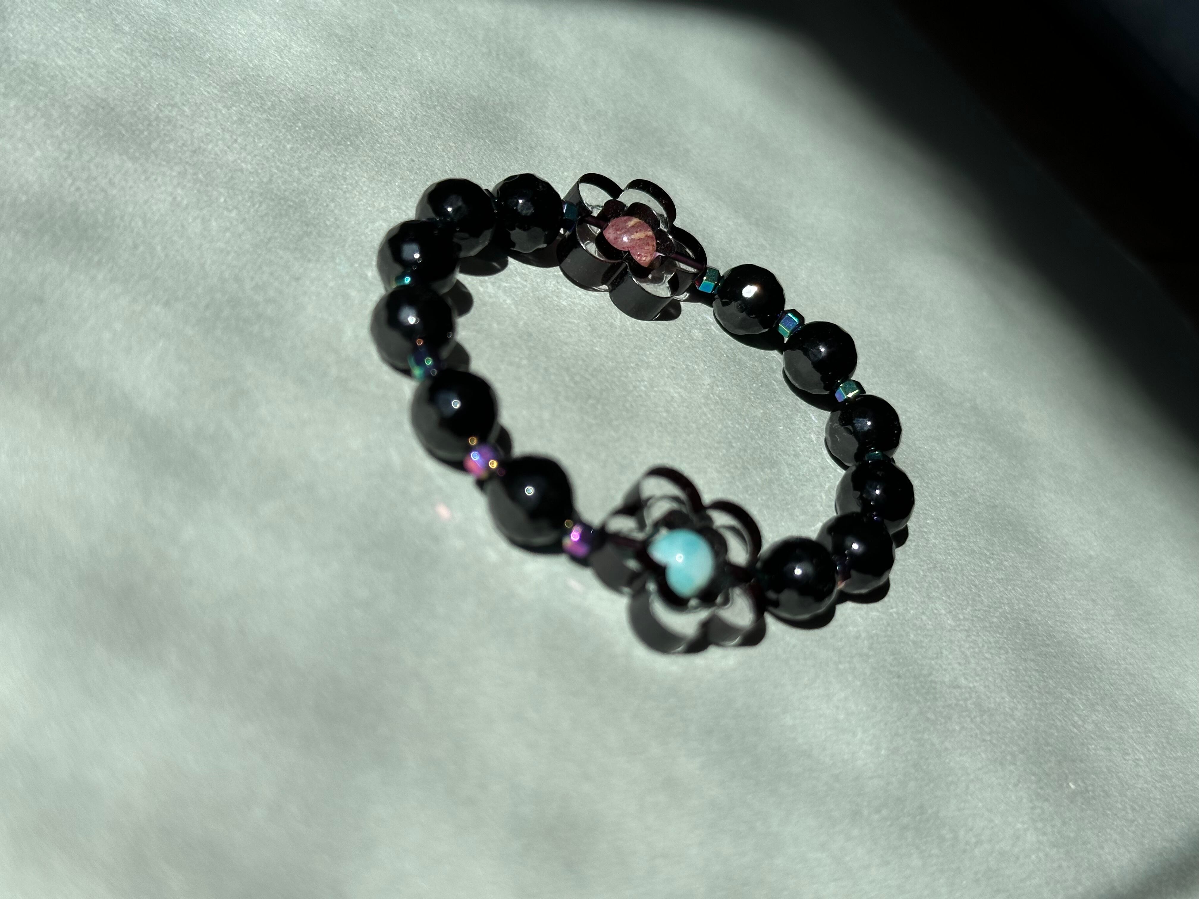 黒瑠璃といわれているブラックオニキスはキラキラと輝くミラーボールカット仕様、宇宙を思わせる玉虫色のヘマタイト、クリアブラックのフラワーパーツの中には三裂星雲のようなカラーの水色のアマゾナイトと複雑な模様が特徴のストロベリークォーツ。