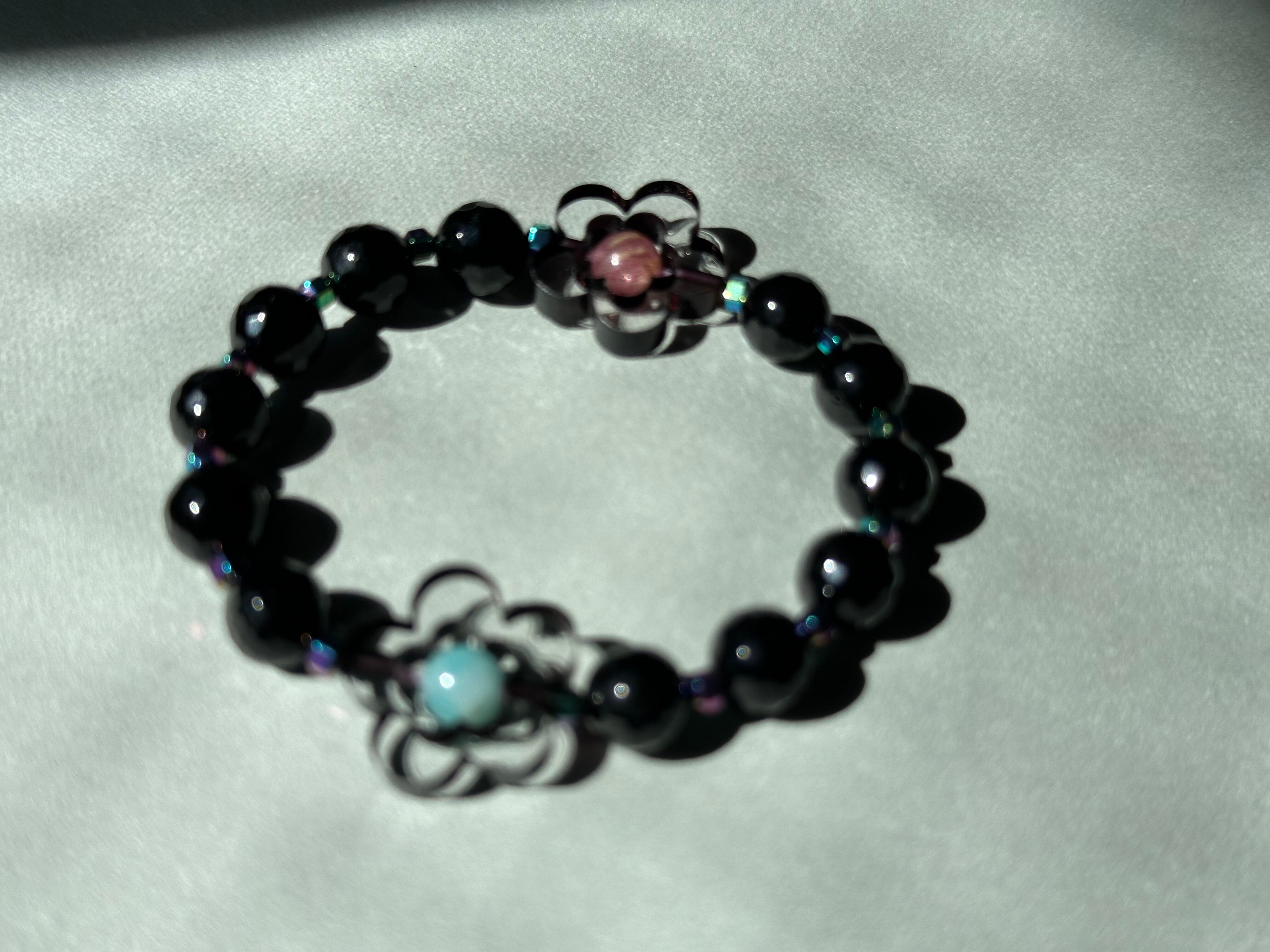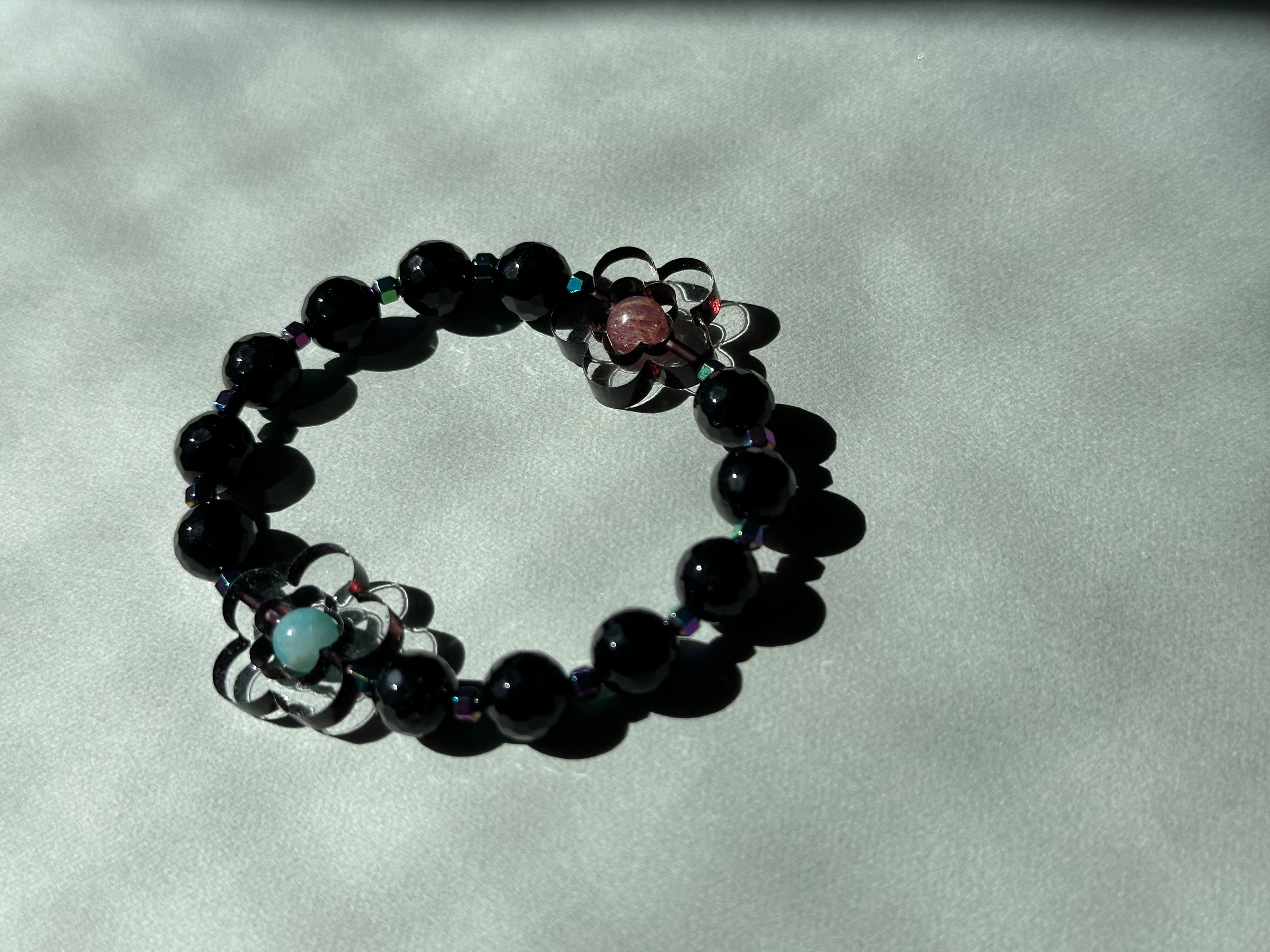 ブラックオニキス・ミラーカット8mm,ヘマタイト3mm, アマゾナイト6mm,ストロベリークォーツ6mm,クリアブラックフラワー