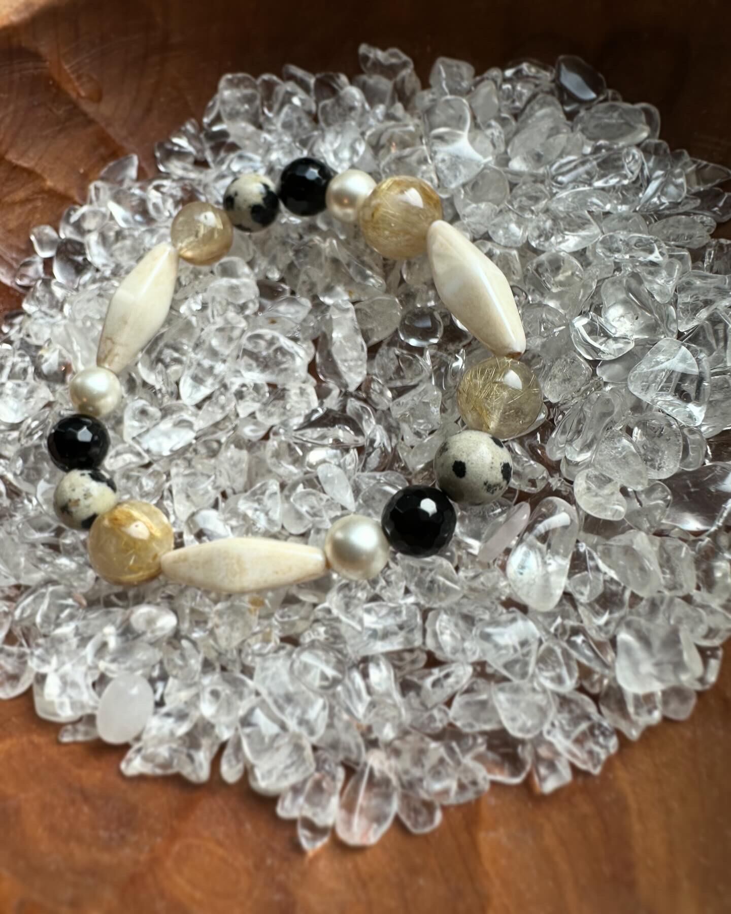 ルチルクォーツ11mm,8mm,ダルメシアンジャスパー8mm,ブラックオニキス・ミラーカット8mm,ガラスパール7mm,チェコビーズバイコーン